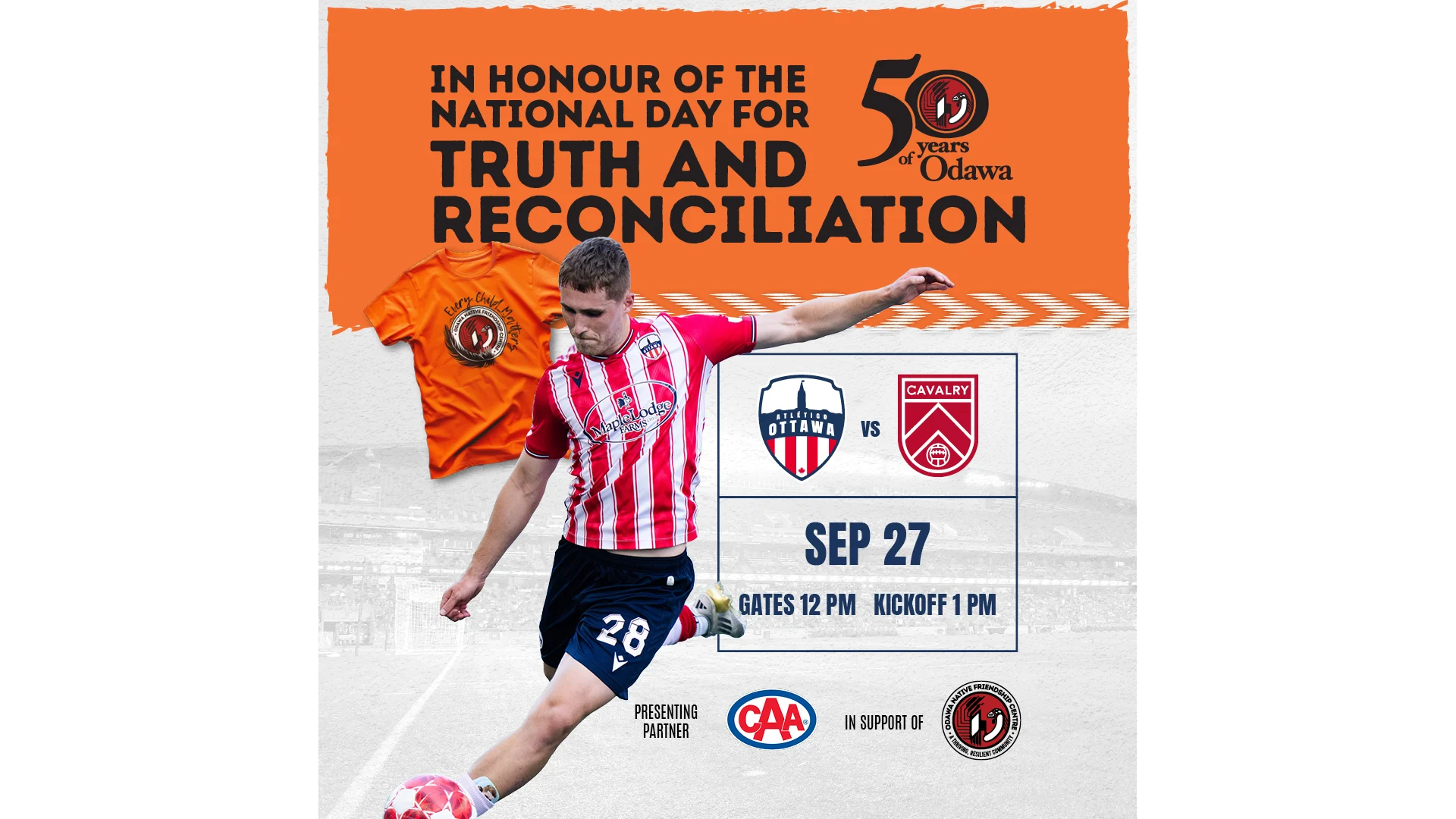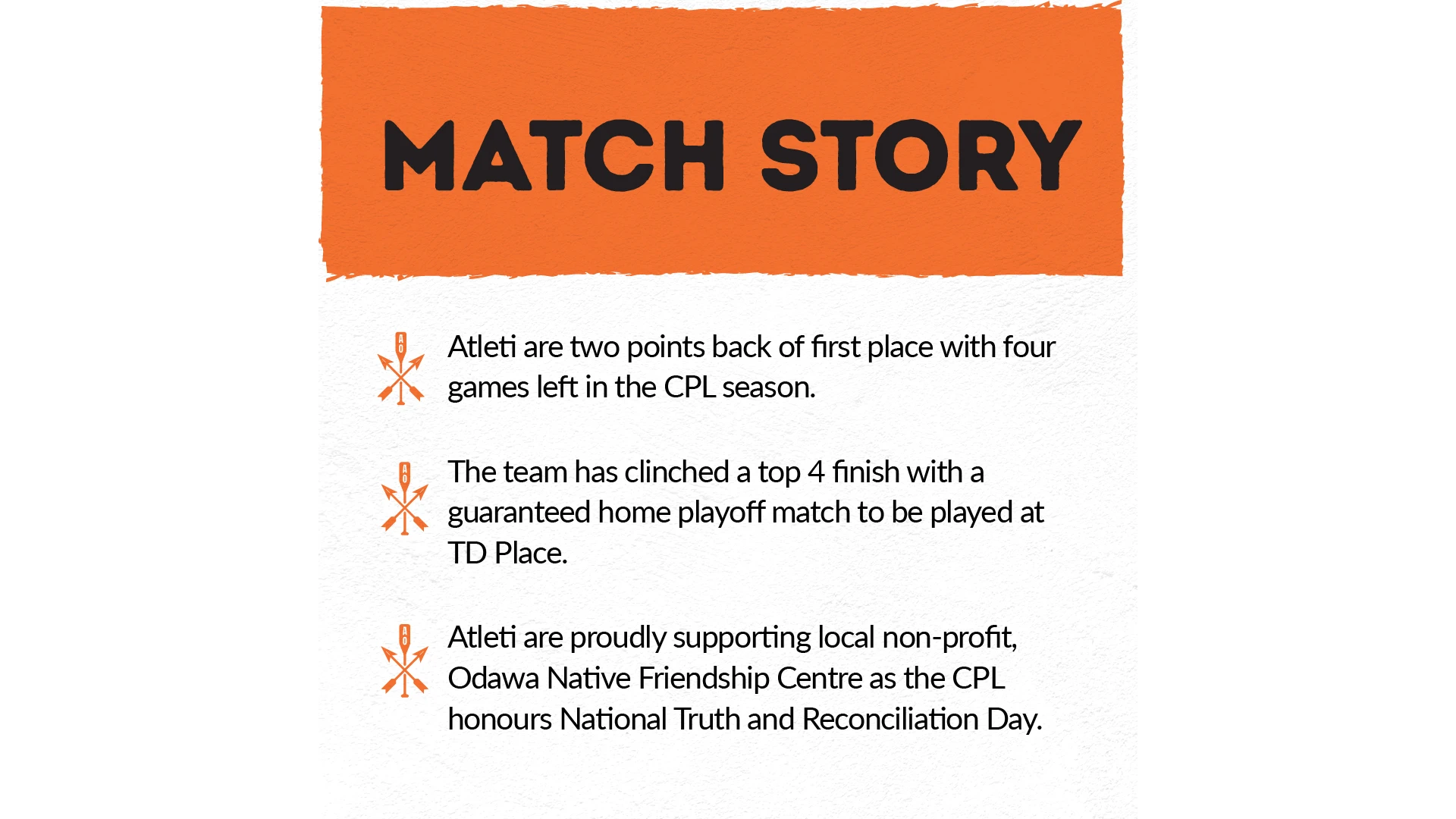 Après un match nul contre le Forge la semaine dernière, l'Atlético Ottawa cherchera à rester au contact des leaders du championnat lors d'un match crucial contre le Cavalry, troisième au classement (coup d'envoi à 13 h HE, en direct sur TSN et OneSoccer). L'Atleti aidera également l'organisme local à but non lucratif Odawa Native Friendship Centre (ONFC) à célébrer son 50e anniversaire en soutien à la Journée nationale de la vérité et de la réconciliation.