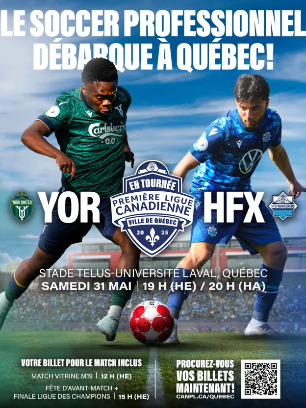 York United et les Wanderers de Halifax s'affrontent le samedi 31 mai à 19h au stade Telus de l'Université Laval. Achetez vos billets pour le match de la PLC 'En tournée' ici.