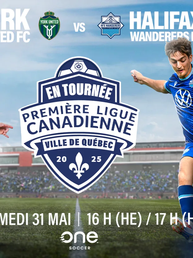 Le match « En tournée » 2025 opposera le York United FC aux Wanderers de Halifax au Stade Telus-Université Laval à Québec. La rencontre sera diffusée à l’échelle nationale et internationale sur OneSoccer, le domicile du soccer canadien, le samedi 31 mai à 19 h (HE) / 16 h (HP).